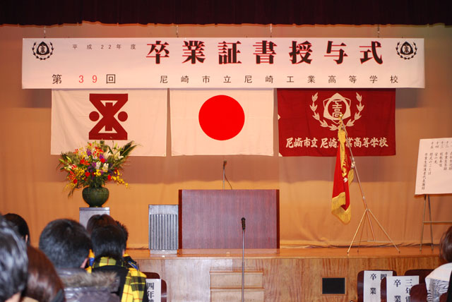 機械科4年生9名、電気科4年生7名、機械科3年生3名、電気科3年生3名の合計22名が市立尼崎工業高等学校を卒業しました。卒業証書授与式 式次第