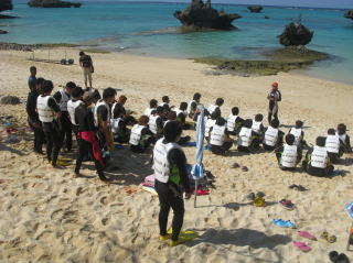 7:00 起床 各部屋へ伝達 7:30 片付け 部屋内を片付けておく 8:00 朝食 一日の活動のため、朝食は摂る 9:00 宿舎出発 貸切バスでムーンビーチに移動 9:30 ムーンビーチ到着 到着後は開校式および諸注意 10:00 体験学習 午前の部 ナップ島ツアー(判別行動)”無人島” 12:30 昼食 バイキング形式にて自由に 13:30 午後の部 開始 各種アクティビティ(判別行動) 15:30 閉校式・移動準備 着替えを済ませます 16:00 琉球村へ移動 バスにて移動 16:30 琉球村到着 施設内見学 17:30 宿舎へ向けて移動 18:00 宿舎到着 18:30 夕食 沖縄の郷土料理 19:00 文化交流 三味線の実演を依頼 20:00 全体ミーティング 20:40 解散 各部屋にて自由時間(食堂でVTR上映) 22:00 人員点呼 外出は禁止 22:30 就寝準備 就寝