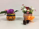 秋の草花を使い、秋らしいアレンジメントに加え、かぼちゃやおばけ、黒猫といったハロ