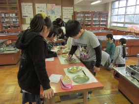 25分休みには家庭科室で豆つかみをしました。