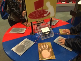 手を銀色や金色の板に合わせると、電流が流れるよ!