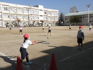 | 3組 バットの代わりにラケットを使ってベースボール型のゲームをしています。かっ飛ばせ~! | |