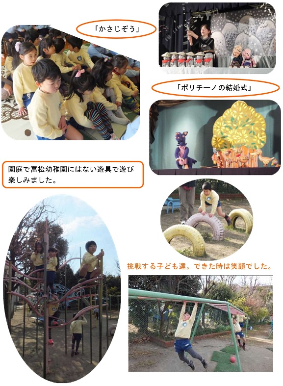 | 立花幼稚園の子ども達と一緒に、人形劇団クラルテの人形劇を見ました。 次々出てくる動物やお話の展開を楽しみながら、真剣に見ていた子ども達でした。 |