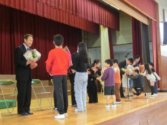 4月10日(木) 4月から園田小学校を離れ他校に転出された先生方に集まっていただいて離任式を行いました。離任式では、先生方からお話をしていただいたあと、子どもたちの代表があいさつと花束を手渡しました。最後は子どもたちの中を手を振りながら先生方は退場されました。子どもたちは先生方との別れを惜しんでいました。 |