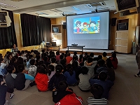 各クラス順番にランチルームで給食を食べています。今日は5年生1組の子どもたちです。みんなで楽しく給食を食べた後に少し栄養のことについてもお勉強しました。