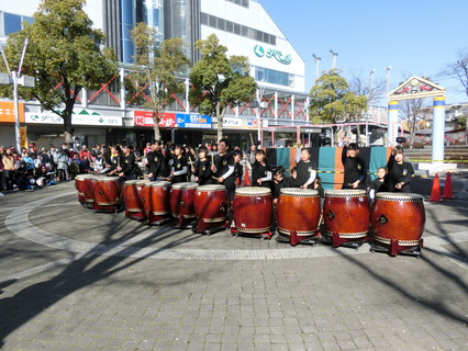 | 阪神電車出屋敷駅前 リベル東側広場で、地域の「豆まき」が行われました。ここでも、本校、和太鼓クラブ「竹谷っ鼓童」が大活躍。「豆まき」の雰囲気を盛り上げました。(ちょっと、太鼓が転がってしまうというハプニングはありましたが・・・みんな落ち着いて演奏していました。) |