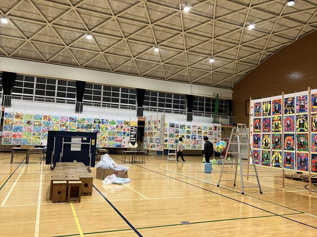 図工展に向けて、着々と準備を進めています。平面作品を搬入し、立体作品も搬入しました。 体育館が美術館へと早変わり。お楽しみに! (写真は準備中の様子です。) |