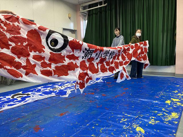 小田地域課の方が来て下さり、大きなこいのぼりに夢を書くスイミープロジェクトを行いました。 小田地域の8つの小学校の子どもたちが、スイミーに見立てた魚に、夢や願いを書き、毎年、ゴールデンウィークの期間、キューズモールに飾られています。 潮小学校では毎年2年生が、このプロジェクトに参加しています。高校生がスイミーや魚のスタンプを作る。書道の先生が文字を書くなど、私たちが過ごす地域のたくさんの方が関わり、暮らしていることを、そのつながりを少しでも感じてもらえたらなと思います。 |