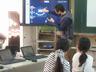 担任の先生の授業に、ICT支援員さんが加わり、情報機器を活用しながら授業をしているところです。