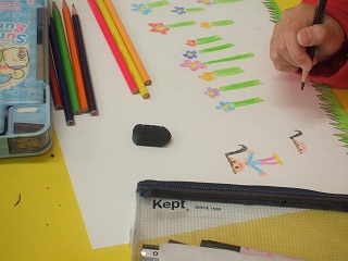 国語で学習したくじらぐも(写真では子ども達がくじらぐもに乗っています。)から見た町や自然の様子を子ども達は色画用紙で作成していました。みなさん絵を描いて、それを切り貼りしたりするのを楽しんでいました。