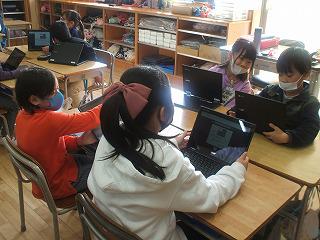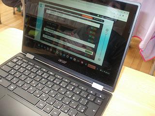 お知らせする内容について考え、それについてスピーチする様子を自分たちで録画しています。その後、動画を見てよりよいスピーチに直していくのだと思われます。
