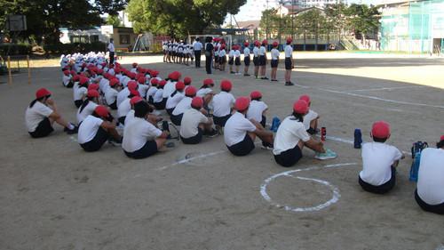 とても日差しが強く、暑い中での練習となりましたが、ふざけたり、だらけたりする児童は一人もいませんでした。 前に立つ代表児童や先生の真似をして、ストレッチ体操にも丁寧に取り組んでいます。