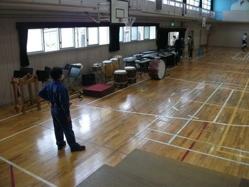 | 体育館の再度に、大量の楽器が並んでいます。運んでみるとかなりの量です。 | 右下に見えるのが、伝統の大型ひな壇です。コロナ禍でソーシャルディスタンスを取るには、もってこいの広さです。 |