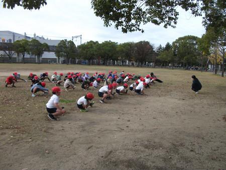 | 【縄跳び】あや跳び、2重跳びと果敢に挑戦しています。なわとびカードがあり、その課題をクリアすると何級・何段と認定してもらえるようです。 | 【陣取り遊び】左右の陣地からタイヤを跳び越え相手陣地に進みます。途中で出会ったらじゃんけん。勝てばそのまま進むことができます。じゃんけんで負けたチームからは次々と人が出発してきますので、相手陣地にたどり着くまで何度もじゃんけんとなり、いつも勝負は白熱しています。 |