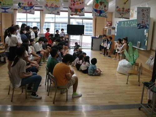 | 緊張のためか、考えたセリフが出なかったり、物語の途中で動かないはずのかぶが動いたりしましたが、どのグループも最後には無事、大きなかぶを引き抜くことができました。劇の後、6年生から多くの誉めことばをもらい、達成感に満ちた1年生の素敵な笑顔が、教室中にあふれかえっていました。 | |