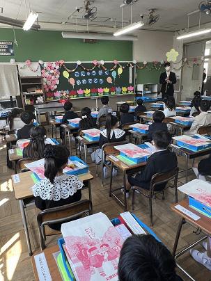 6年生のプレゼントを胸に1年生が楽しそうに入場しました。