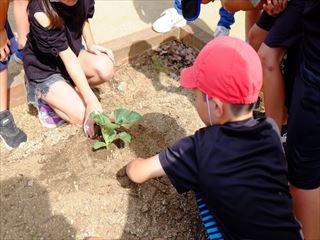 何でも挑戦しようとする4年生のみんなは、「植えたい!植えたい‼」と3つしかないひょうたんの苗に群がっていました。