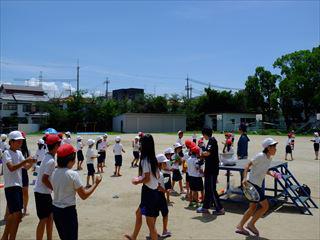成文小学校では、1・6年生、2・5年生、3・4年生がペア学年となって、年間を通してさまざまな交流を行っています。 昨今の少子化で一人っ子家庭が増えたことに加え、昔のように異学年の子どもたちが縦の交流をすることは本当に少なくなってきています。学校教育の一環として、意図的に仕組まなければならない状況にあります。 今回は暑い日が続いていることもあり、児童会が企画して運動場で水遊びをしました。題して『成文ウォーターバトルでいきのこれ 水風船ボム』です。 |