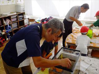 最初は恐る恐る川に入っていった子どもたちも、だんだん大胆に川の生き物探しに取り組み始めました。 子どもって素晴らしい! 最後は見つけた生き物を講師の先生方に見てもらって、いろいろ質問していました。 |