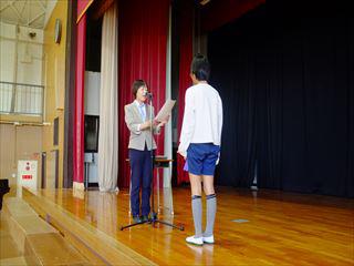 校長先生からは音楽にまつわる絵本を3冊紹介してもらいました。『おんがくかいのよる』、『おんがくはまほう』、『はじめてのオーケストラ』という絵本です。どの絵本もいいところで紹介が終わったので、多くの子たちが「続きはどうなるのかなぁ?」と興味が湧いているようでした。 続いて表彰の時間。 家庭科作品展、社会科作品展の表彰がありました。 |