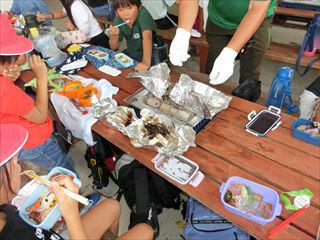 | 昼食は各自が持参したお弁当に加えて(お弁当のご準備ありがとうございました!)、釣り体験をした場所で魚の切り身を用意して下さっていて、ホイル焼きにしていただきました。 | |