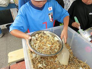 最初は恐る恐る川に入っていった子どもたちも、だんだん大胆に川の生き物探しに取り組み始めました。 子どもって素晴らしい! 最後は見つけた生き物を講師の先生方に見てもらって、いろいろ質問していました。 |