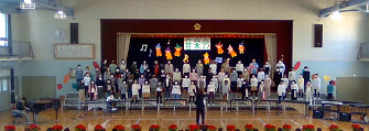 | 1年生(斉唱「ともだちになろうよ」) | 1年生(合奏「ミッキーマウス・マーチ」) |