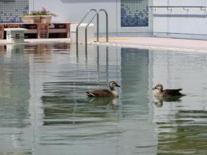 5/2(火)、本校のプールにカモが2羽遊び(休憩)に来ていました。今日は天気が良く、2羽とも気持ち良さそうに泳いだり、毛づくろいをしたりとくつろいでいるように見えました。水泳の授業が始まる頃まで、本校でゆっくりするのでしょうか? |