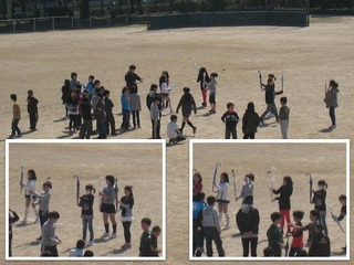 また、小運動場では写真のようにボーリングをしています。ボーリングと言ってもボールを転がしてピンを倒す