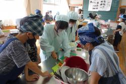 5年生が調理実習をしています。野菜を茹でて、サラダにします。 ニンジンやブロッコリー、キャベツなどを食べやすいサイズに切って茹でます。 そして、フレンチドレッシング(酢、塩、サラダ油、コショウ)を作って、茹で野菜サラダに かけて食べます。包丁や火を扱うなど気をつけることも多いですが、子どもたちは張り切って調理 に取り組んでいました。 |