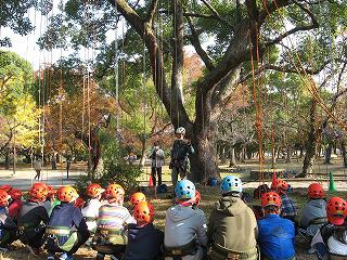 | ツリーイングでは、指導員の方から「勇気を出して、チャレンジしてみてください」とのお話もあり、皆さんは教えていただいたことを思い出しながら登っていました。中には、コツをつかんだのか、あっという間に高いところまで登る児童もいました。指導員の方からは「木の音、葉の音を聞いてみて」とか「ふだんは絶対に見れない景色ですよ。よく見てください」など、声をかけていただきました。活動後は、多くの児童が「楽しかった!」「もっと登りたかった」と言っていました。 身近な公園で、ふだんはできない貴重な体験をすることができました。 保護者の皆様、当日の準備やお弁当の用意など、ご協力いただきありがとうございました。 |