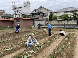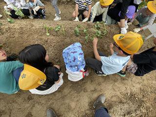 2年生は、小さな子に、芋(いも)のなえのうえかたを