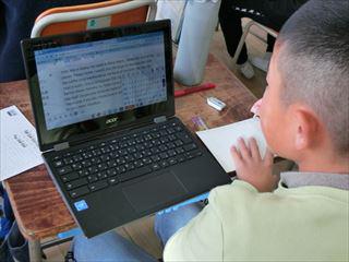 タブレットを使って、日本語を英語に翻訳し、英語でマレーシアの小学生に返事を書いています。