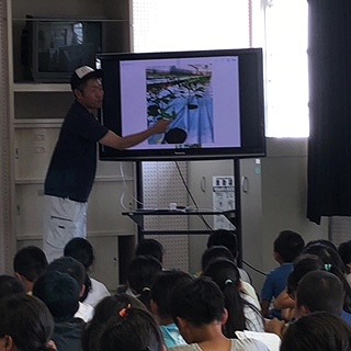 7月18日、コテラトマトの小寺清隆さんが出前授業に来てくださいました。本当は、農場に見学に行く予定でしたが、高温注意報が出ていたため、急遽、学校に来てくださることになり出前授業が実現しました。対象は4年生です。小寺さんは小学校2年生の時に、農業をする事を決意。そのきっかけは、ご自身の家の田が社会見学の場所になり、泥だらけになって田植えをされるお父さんがかっこよく、輝いて見えたからだそうです。どのように学び、試行錯誤されておいしい完熟トマトを作られたのか、映像も用いてお話がありました。最後にたくさんの質問にお答えいただきました。今日の授業で、夢に向かって、あきらめないで努力する心を教えていただきました。素敵な授業を、ありがとうございました。