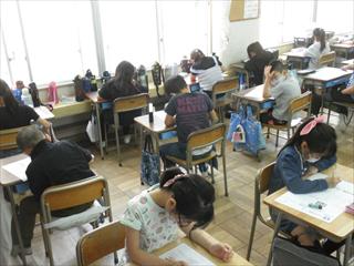 | 2組 算数のテストをしています。全問、解答できたでしょうか? いい点数が取れているといいね。 | |