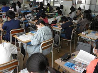 | 3組 算数の練習問題をしています。机を班の形にして、教え合ったり注意し合ったりします。 | |