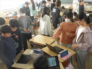| 4組 お楽しみ会の準備で、グループに分かれて出し物の相談をしています。楽しい会になるといいね。 | ||