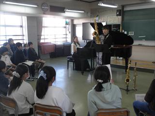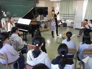 「おでかけアルカイック」という事業で、プロの演奏家の方に来ていただき、コンサートを行いました。 サクソフォンとピアノで、クラシックやジャズの曲を聴かせていただきました。素晴らしかったですね。 |