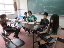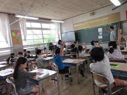 | 5-1 外国語。英語とボディランゲージだけで、同じ誕生月の仲間を見つけるゲームをしました。1組は12月生まれが一番多かったです。 | 5-2 社会担当の3組の先生と沖縄の気候風土について調べています。 | |
