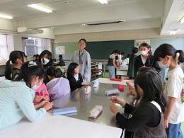 | 5-3 理科担当の2組の先生とめだかのオスとメスの違いについて学習しています。 | 5-4 初めてのお裁縫。針に糸を通したり、玉止めをしたり、どのクラスもおうちの方にお手伝いしていただきました。ありがとうございます! | |