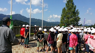 さー。みんな揃って記念の写真を写しました。みんなうれしそうです、うきうきしています、きっとすてきな自然学校になるでしょうね。背景の山々が綺麗です。