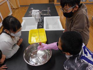 | 4年生が、理科室で実験をしていました。ガラス管にゼリーをつめて、お湯で空気を暖めるとどうなるかを観察しています。班ごとに楽しく学習できていました。 | |