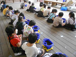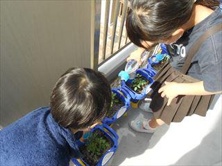 | 1年生はアサガオ、2年生はミニ野菜、3年生はホウセンカ・マリーゴールド。どの植物も育ち盛り。「もうちょっと水あげた方がいいと思う?」子ども達は、朝から愛情をこめて水やりに大忙しです。 | |