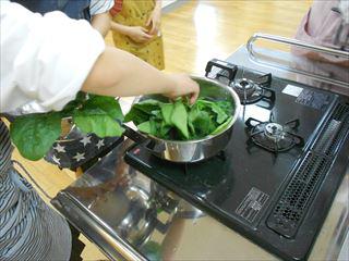 5年生が、担任の先生と栄養教諭に指導してもらって「ほうれん草のおひたし」を作っています。 「そこ熱いから、気をつけて」「ねこの手で切らなあかんで」教えられたことを、確かめ合いながら作っていきます。 ご家庭の献立に一品増えるかもしれません。 |