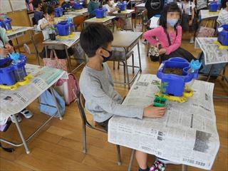 | 2年生は、オクラやミニトマトなどの野菜です。野菜の苗を植木鉢に移し替えて、これから大切に育てます。 | |