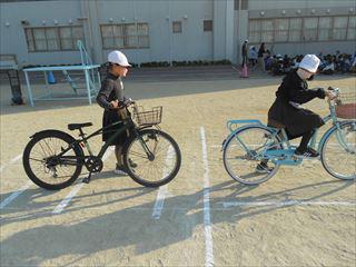 尼崎市役所交通安全課の方に来ていただいて、3年生が自転車の乗り方について学習しました。青信号でももう一度左右と右後ろを確かめてから交差点を進むことや、横断歩道では歩行者と同じなので、自転車をおりて押して進むことなどを学びました。これからも、安全運転でお願いします。後で免許証も送ってくれます。 保護者の皆様には、自転車を持ってきていただくなとご協力ありがとうございました。持ってきていただいた自転車もきれいにそろえていただき、気持ち良かったです。 |