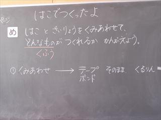 | 1年生が、おうちからもってきたはこを使って、色々なものを作っています。めあてにあるように、しっかり考えて工夫しながら作っていました。イメージ通りに作れたのか、「みてみて~」と満面の笑みで近づいてくる子が何人もいました。どの子の作品もすばらしいです。 | |
