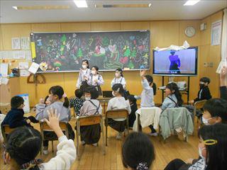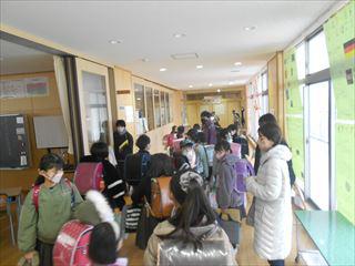 | 校外児童会が始まる前の昼休みに、全員が下ぐつをビニール袋に入れて準備します。放送で、6年生が自分の班の1年生を教室まで呼びに行って、地区の教室まで連れて行ってくれます。地区長、班長の高学年は、2学期も下級生の安全のためにルールを守って集団登校してくれていて、たよりになりました。いつも、ごくろう様です。地区委員のみなさまも、寒い中ありがとうございました。 | |
