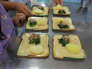 5年生が調理実習で、「青菜のおひたし」と「ゆでいも」を作っています。調理の間に、必要ないものを洗って片づける子もいて、チームワークはばっちりです。そして、栄養の先生と算数専科の先生も手伝ってくれるので、サポート体制もばっちりです。