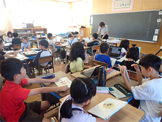 5年生の書写と社会科の学習です。習字は「白馬」、社会科は工業生産の資料を見て疑問点を発表しあっていました。 どちらのクラスの授業も、動と静のメリハリがついているのがとてもよかったです。 |